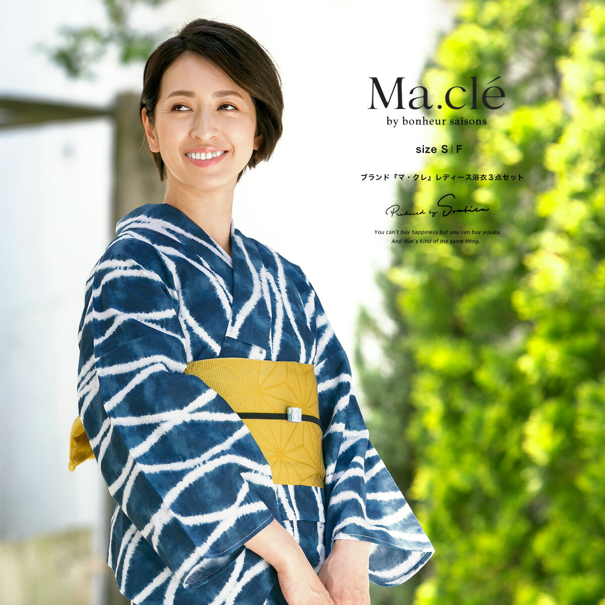 浴衣 セット レディース レトロ 浴衣セット 3点セット 紺 ネイビー クリーム 立涌 ぼかし 綿 モダン 半幅帯 女性 ボヌールセゾン マクレ 30代 40代 ママ 大人浴衣 S フリー 【送料無料】【あす楽対応】